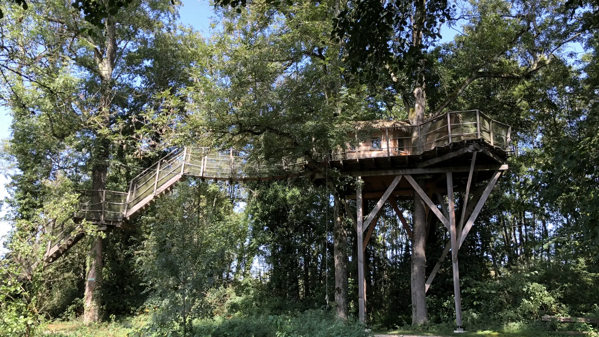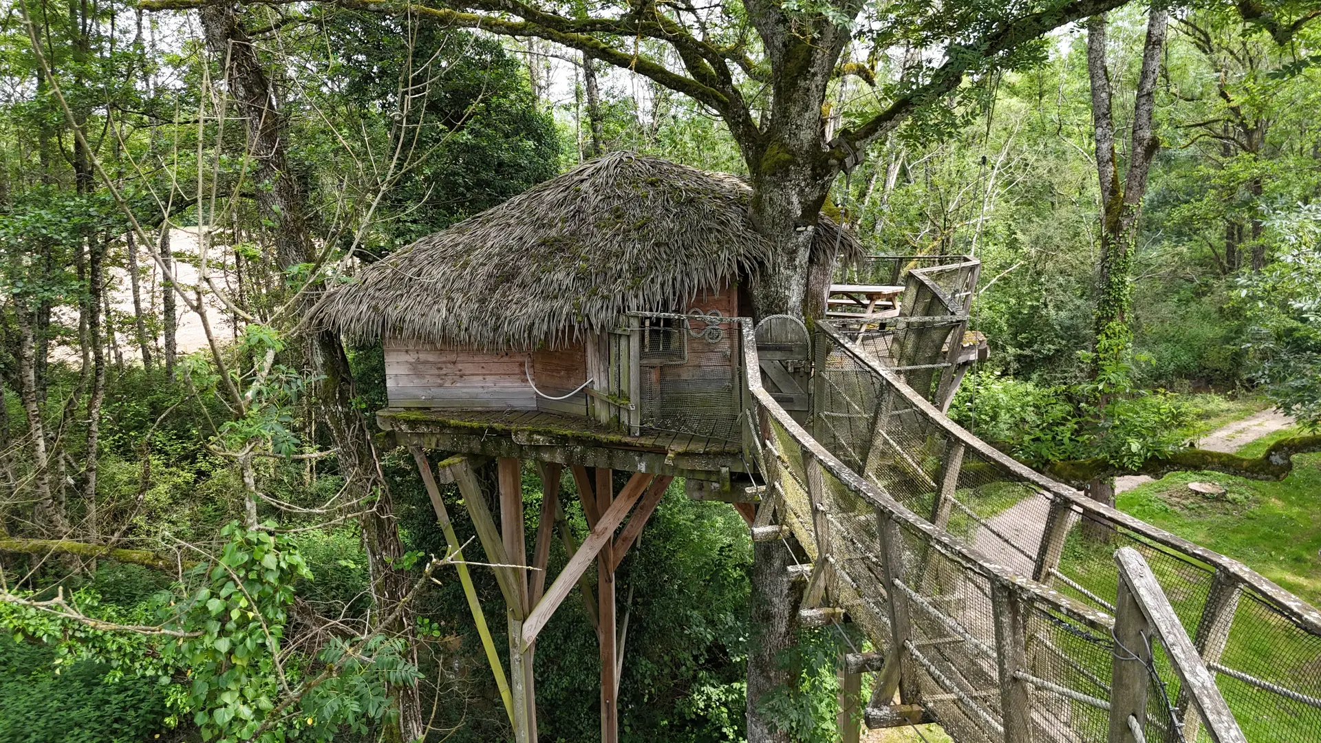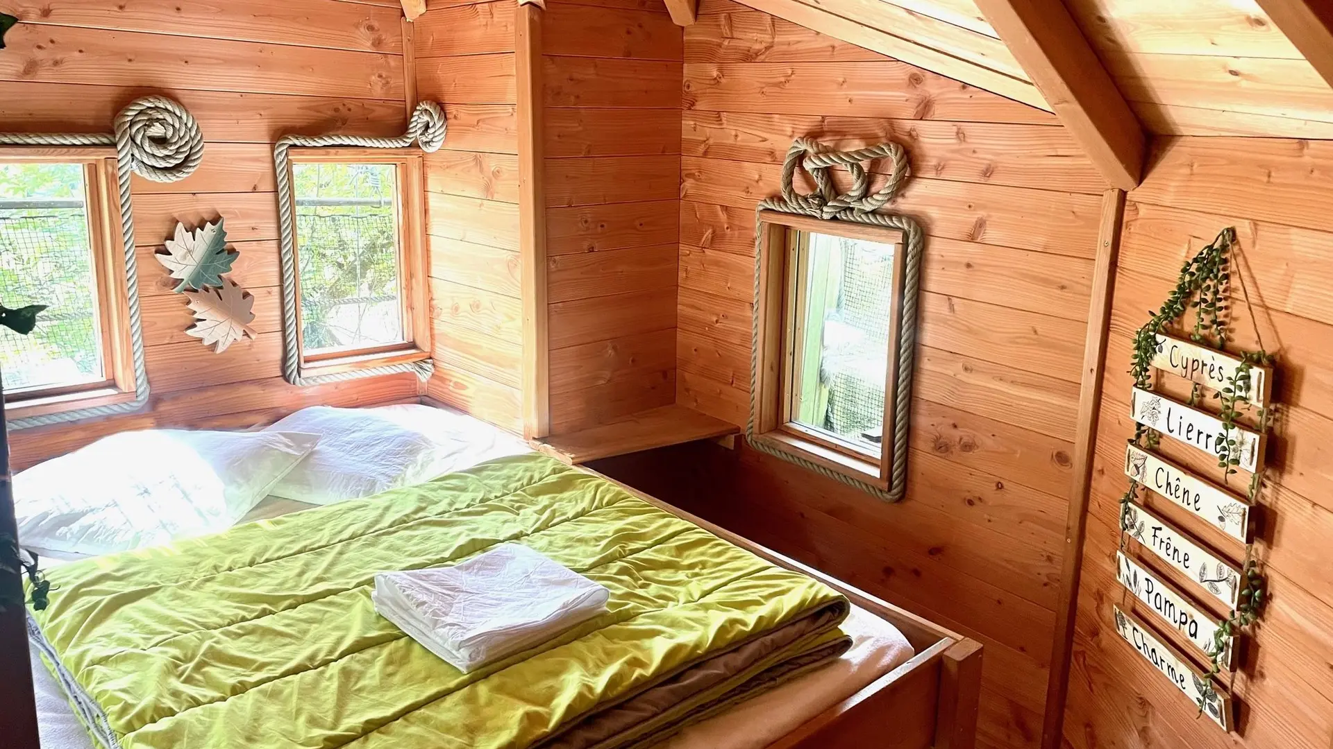 Abgelegenes Baumhaus, das in 12 bis 15 Minuten zu Fuß erreichbar ist. Dieses Baumhaus ist ideal für Familien. Es verfügt über ein Doppelbett und zwei einfache Etagenbetten. Sie werden die herrliche, geräumige Terrasse mit Blick auf den Teich zu schätzen wissen. Der Zugang erfolgt über eine Treppe und eine große Hängebrücke.