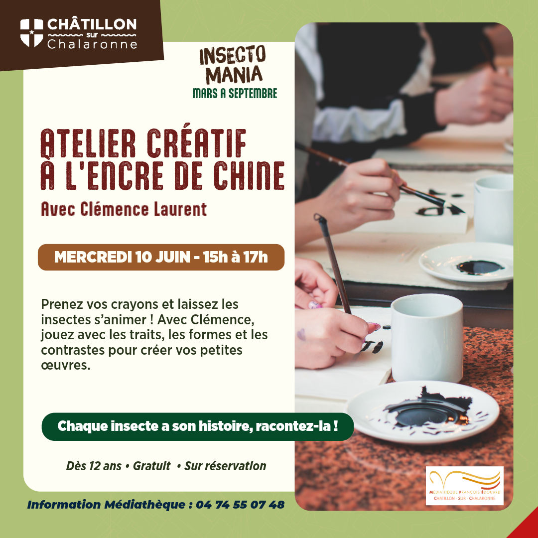 Dans le cadre du projet interservices "Insectomania", nous vous proposons un atelier créatif autour des insectes à l'encre de Chine, animé par Clémence Laurent.