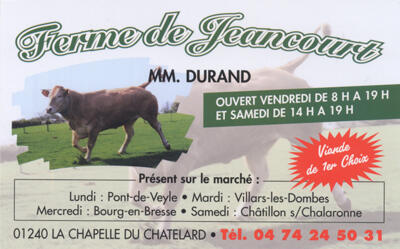 Au cœur de la Dombes tout proche de La Chapelle du Chatelard Serge et Jean-Michel Durand vous proposent sur place viande de boeuf, de porc, charcuterie, volaille