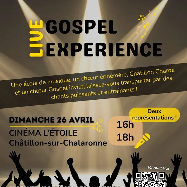 L’École de Musique Municipale de Châtillon-sur-Chalaronne propose le « Gospel Live Experience », un concert participatif réunissant habitants et chorales locales : Châtillon Chante et Gospel La Passerelle (Caluire).