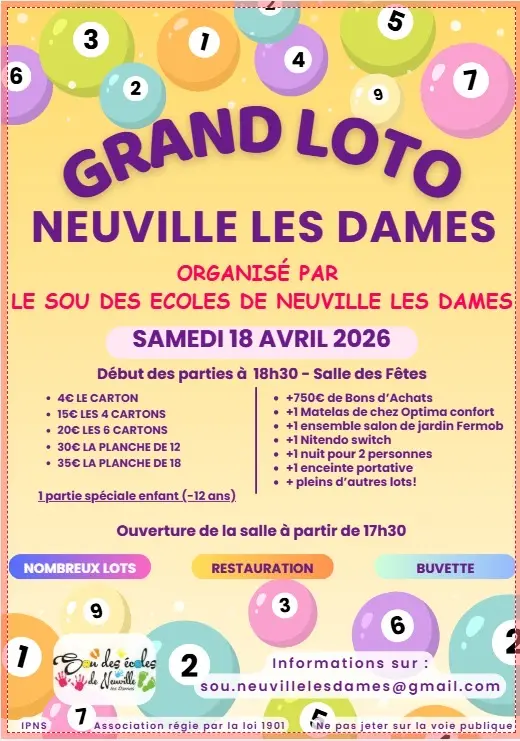 Tentez de remporter des cadeaux en passant un bon moment au loto organisé par le Sou des écoles de Neuville les Dames.
